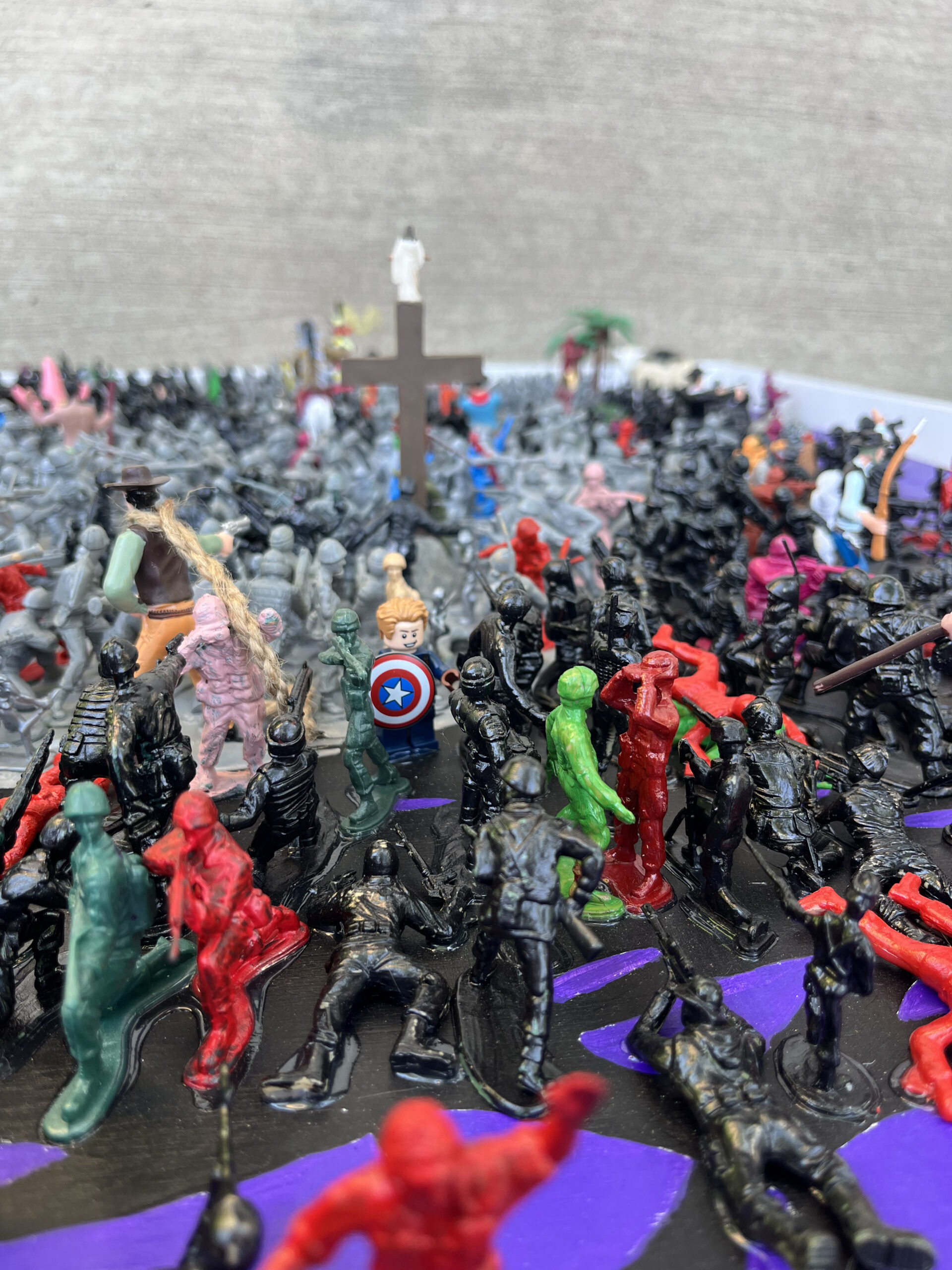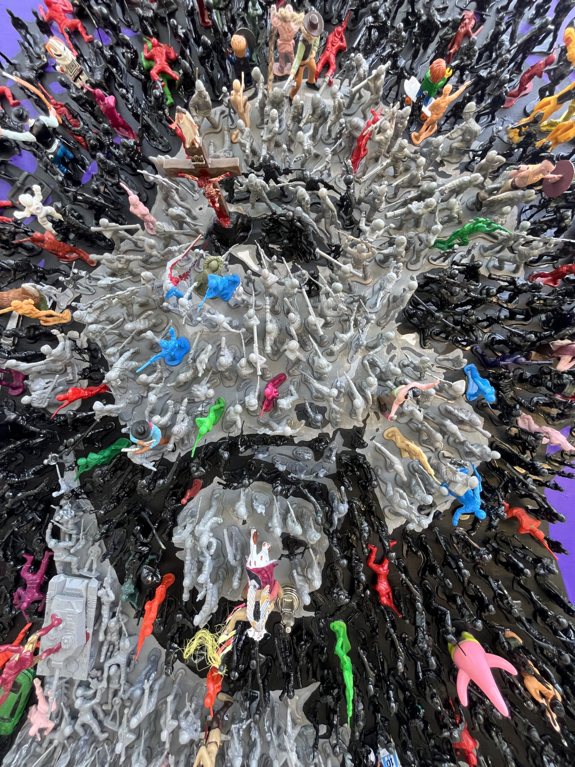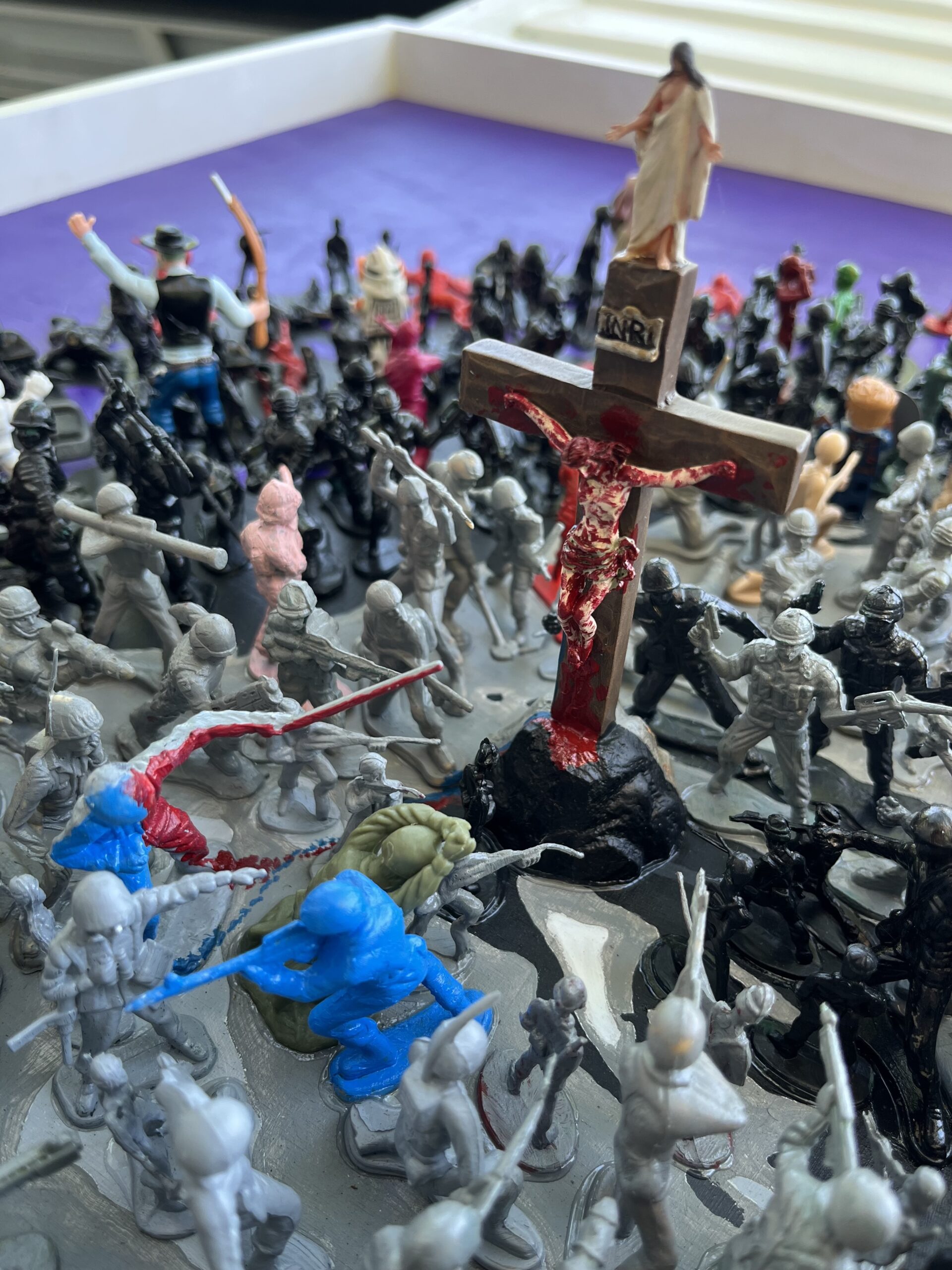 Jesus Revolution is a reflection of the apostolic age we live in today. The 726 black and gray figures represent the culture who all point their weapons at Jesus. The 89 colored figures represent followers of Christ who are outward facing as Jesus’s disciples would’ve been tending to the crowds during his teachings. The only fully blue figures are the 4 teardrops falling from Jesus’s eyes one for each gospel, and a reminder of the shortest scripture verse, “Jesus wept.” The spotless lamb looks to Christ as the One True Lamb. A bloody nail from a live reenactment of the stations of the cross is hidden in the painting. All of the figures in the direction of Ironman’s outstretched hand are shrunk because when the Good News is preached we decrease, and God increases. Paradoxically, Ironman is positioned on the only moving aspect of the painting, a rotating tank, which reveals our daily weakness to turn and join the crowd. The 12, 4 inch cowboys and Indians represent the 12 disciples. Judas is pointing his gun at Jesus behind his back with a noose around his neck. Longinus, the partially blind centurion soldier that pierced Jesus’s side, is painted half blue, half red showing the blood and water that gushed over his face which healed and converted him. Longinus is the only figure depicted twice besides Jesus, we see him in green on his knees bowing down before the crucifix. Zacchaeus is visible in the tree and its sandy base is made from mustard seeds. Birkenstock clips are hidden in each corner of the painting representing the call to go and evangelize the corners of the earth. Phew, that was a lot of symbolism! Good news…there are even more “Easter Eggs” in this painting, if you’d like to find more, reach out and I’ll show you in person! May God bless you!