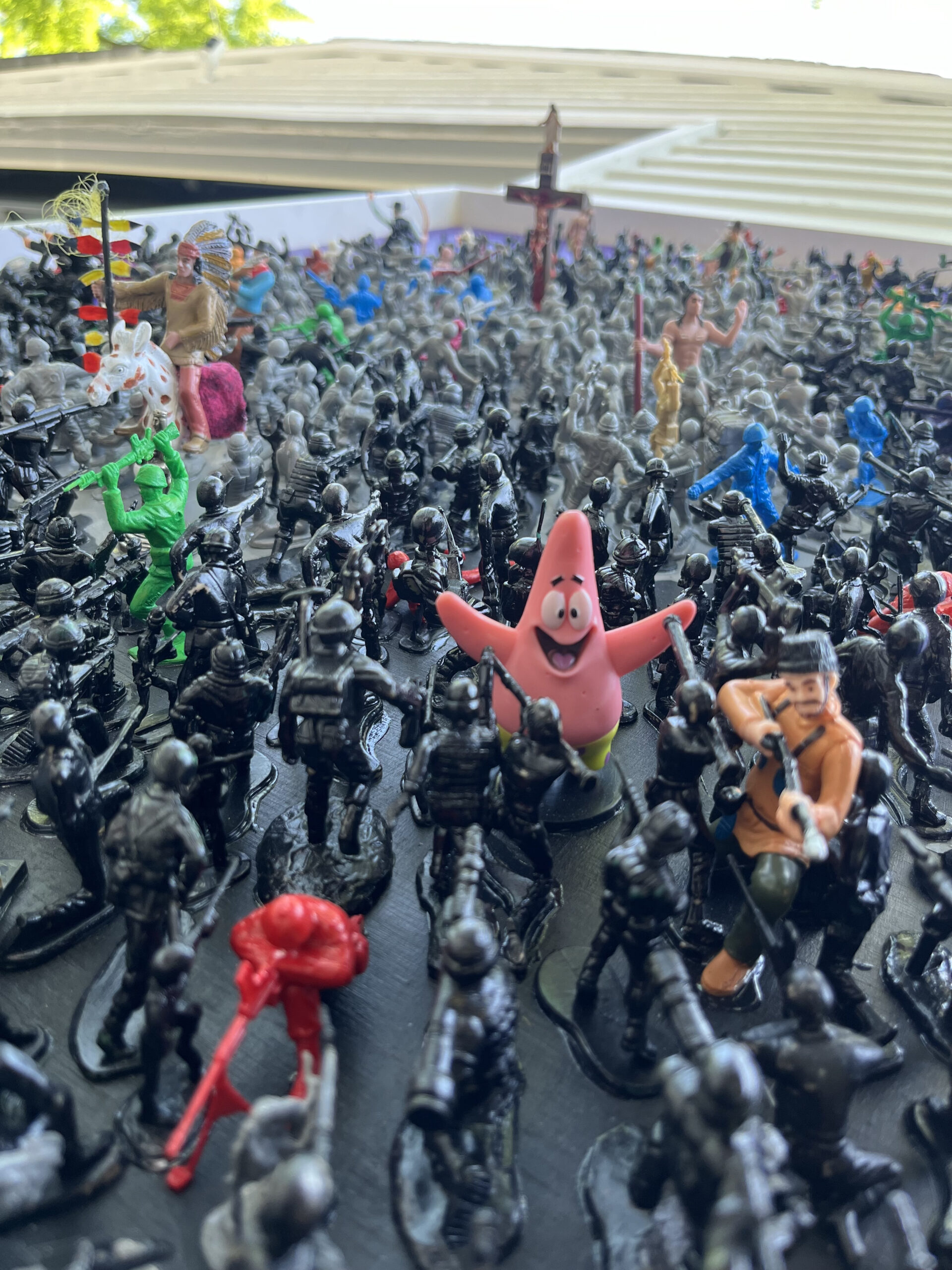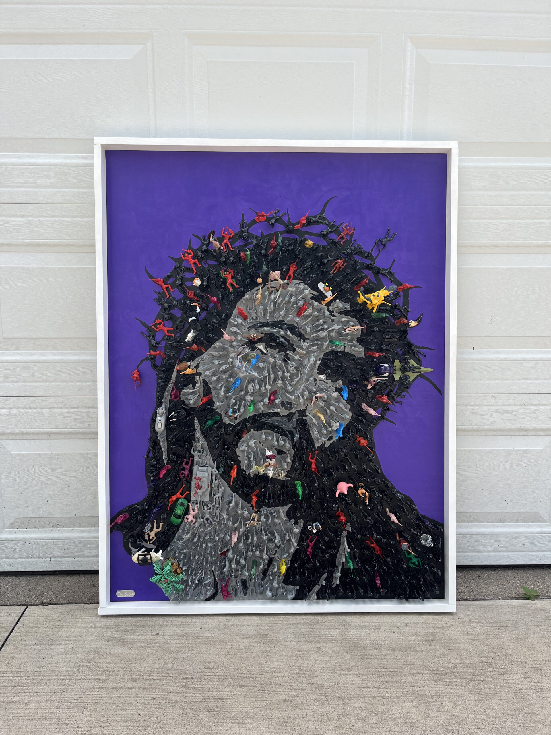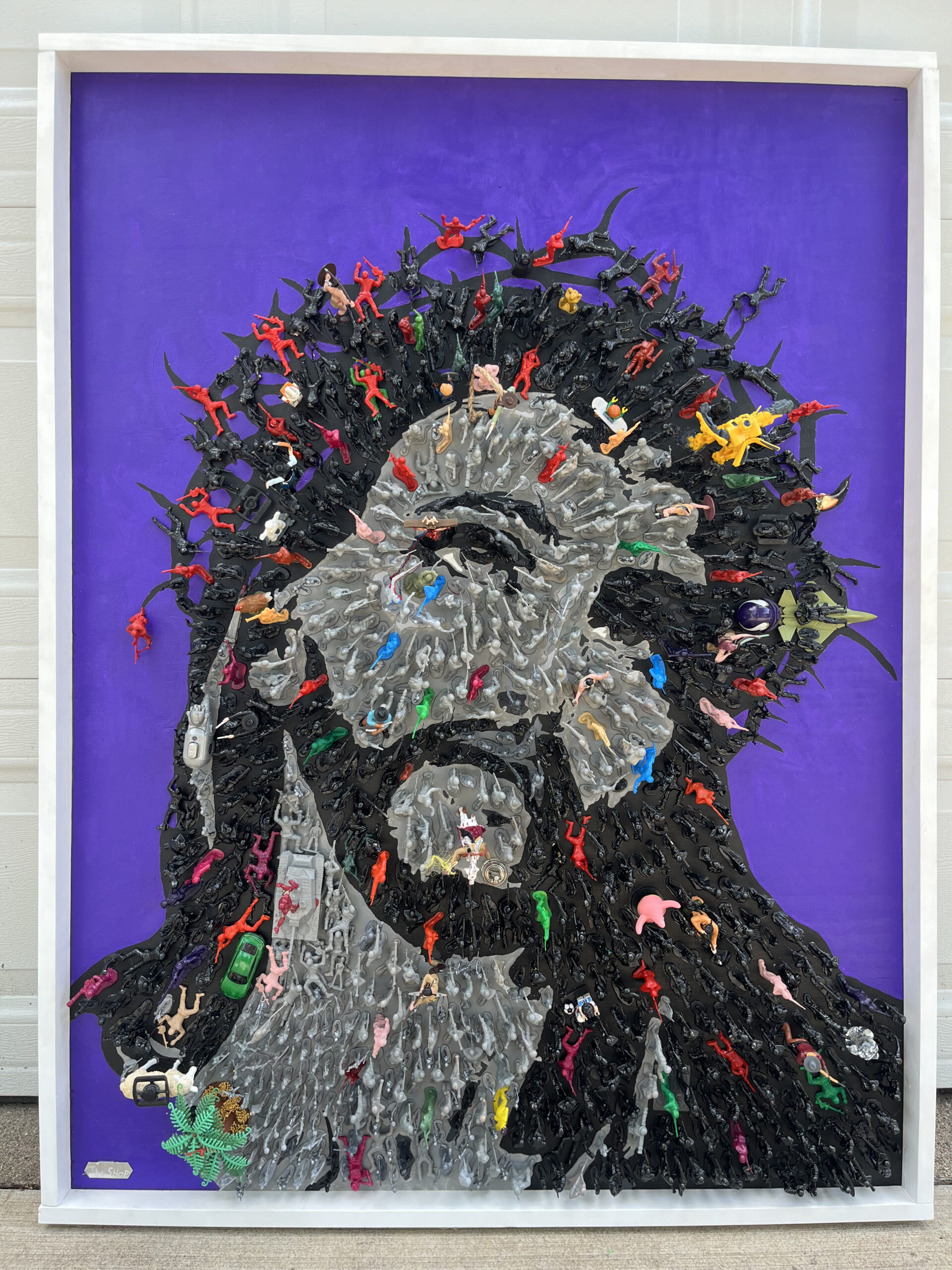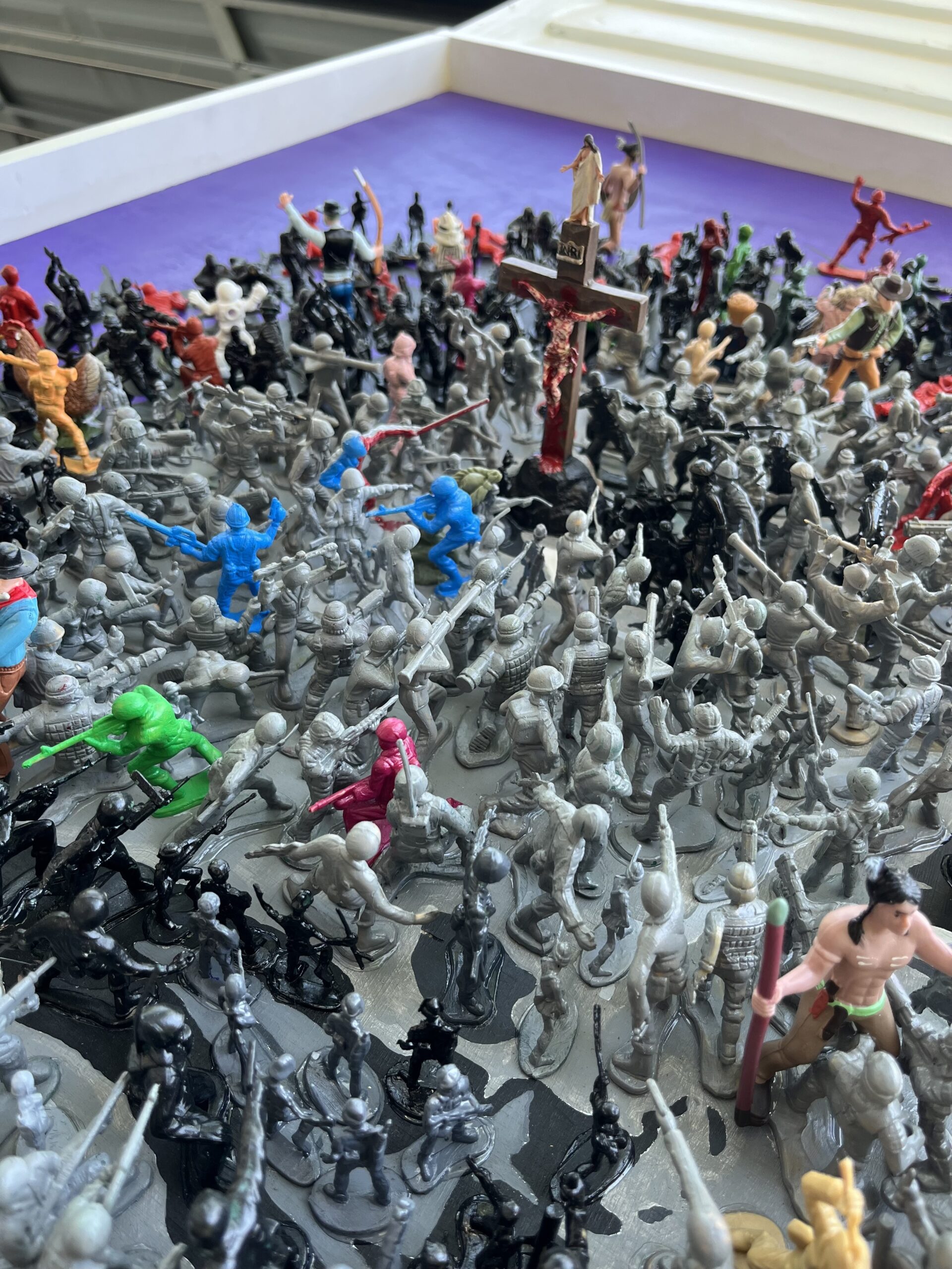 Jesus Revolution is a reflection of the apostolic age we live in today. The 726 black and gray figures represent the culture who all point their weapons at Jesus. The 89 colored figures represent followers of Christ who are outward facing as Jesus’s disciples would’ve been tending to the crowds during his teachings. The only fully blue figures are the 4 teardrops falling from Jesus’s eyes one for each gospel, and a reminder of the shortest scripture verse, “Jesus wept.” The spotless lamb looks to Christ as the One True Lamb. A bloody nail from a live reenactment of the stations of the cross is hidden in the painting. All of the figures in the direction of Ironman’s outstretched hand are shrunk because when the Good News is preached we decrease, and God increases. Paradoxically, Ironman is positioned on the only moving aspect of the painting, a rotating tank, which reveals our daily weakness to turn and join the crowd. The 12, 4 inch cowboys and Indians represent the 12 disciples. Judas is pointing his gun at Jesus behind his back with a noose around his neck. Longinus, the partially blind centurion soldier that pierced Jesus’s side, is painted half blue, half red showing the blood and water that gushed over his face which healed and converted him. Longinus is the only figure depicted twice besides Jesus, we see him in green on his knees bowing down before the crucifix. Zacchaeus is visible in the tree and its sandy base is made from mustard seeds. Birkenstock clips are hidden in each corner of the painting representing the call to go and evangelize the corners of the earth. Phew, that was a lot of symbolism! Good news…there are even more “Easter Eggs” in this painting, if you’d like to find more, reach out and I’ll show you in person! May God bless you!